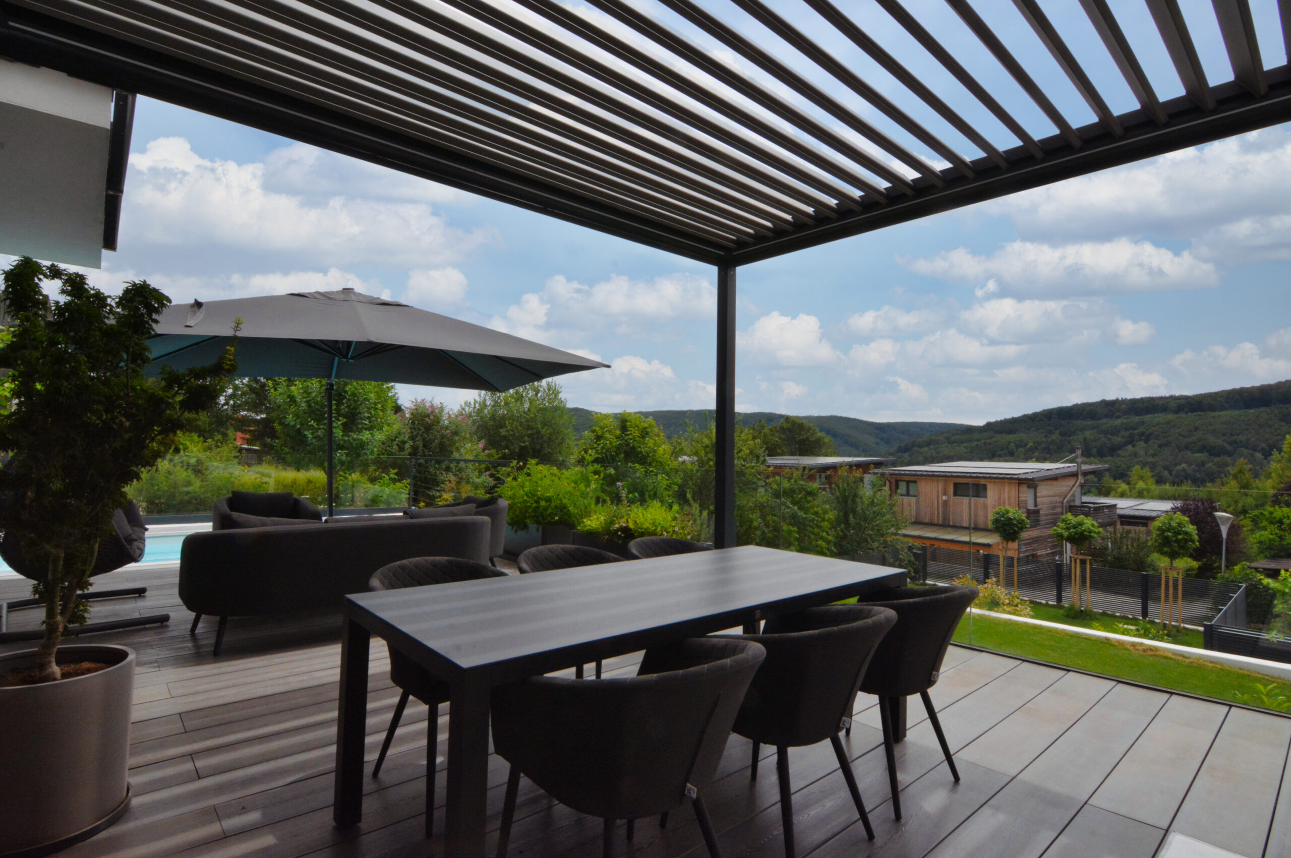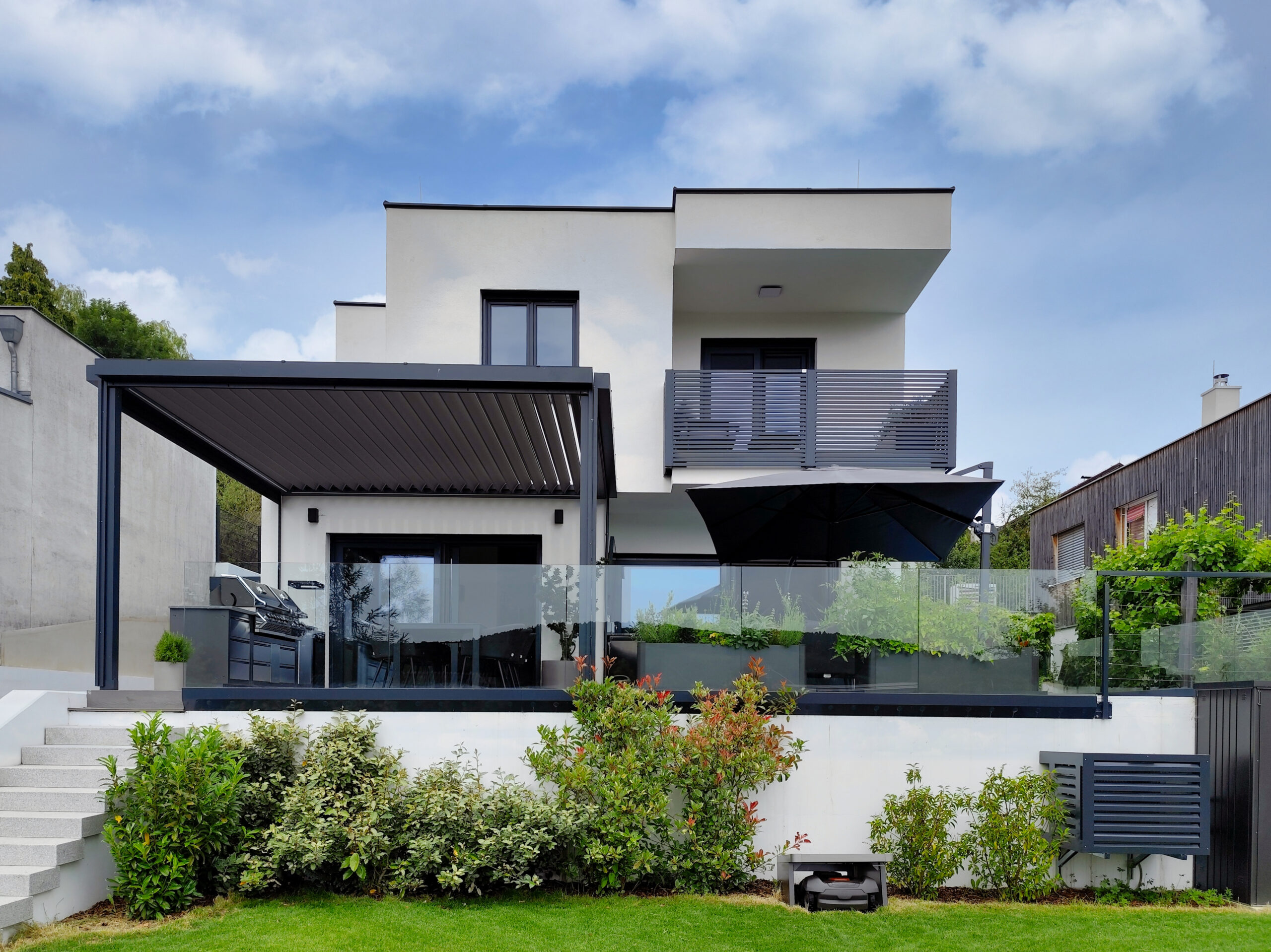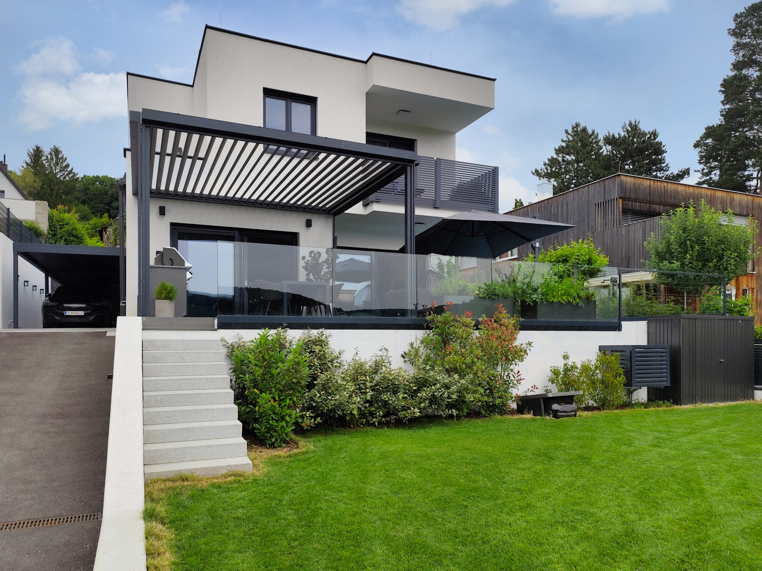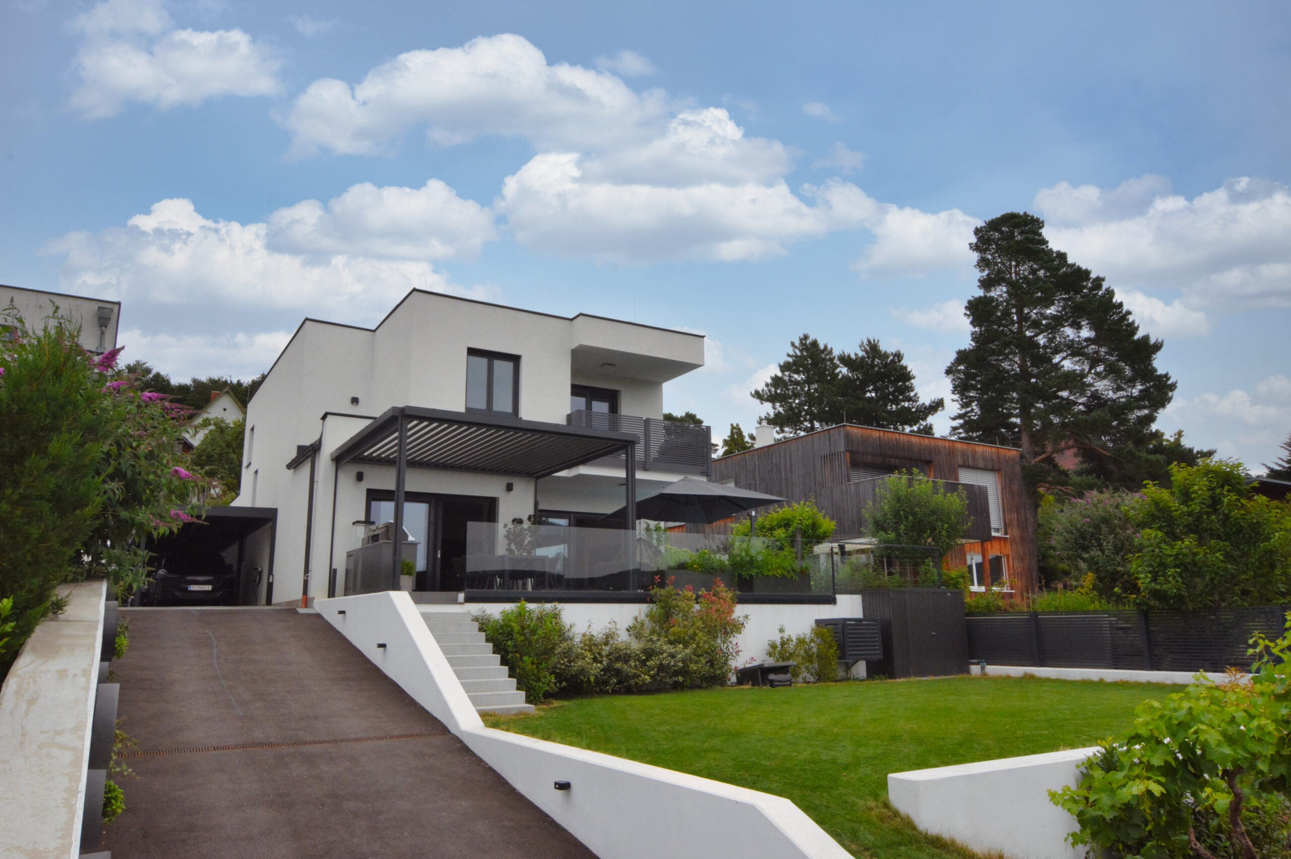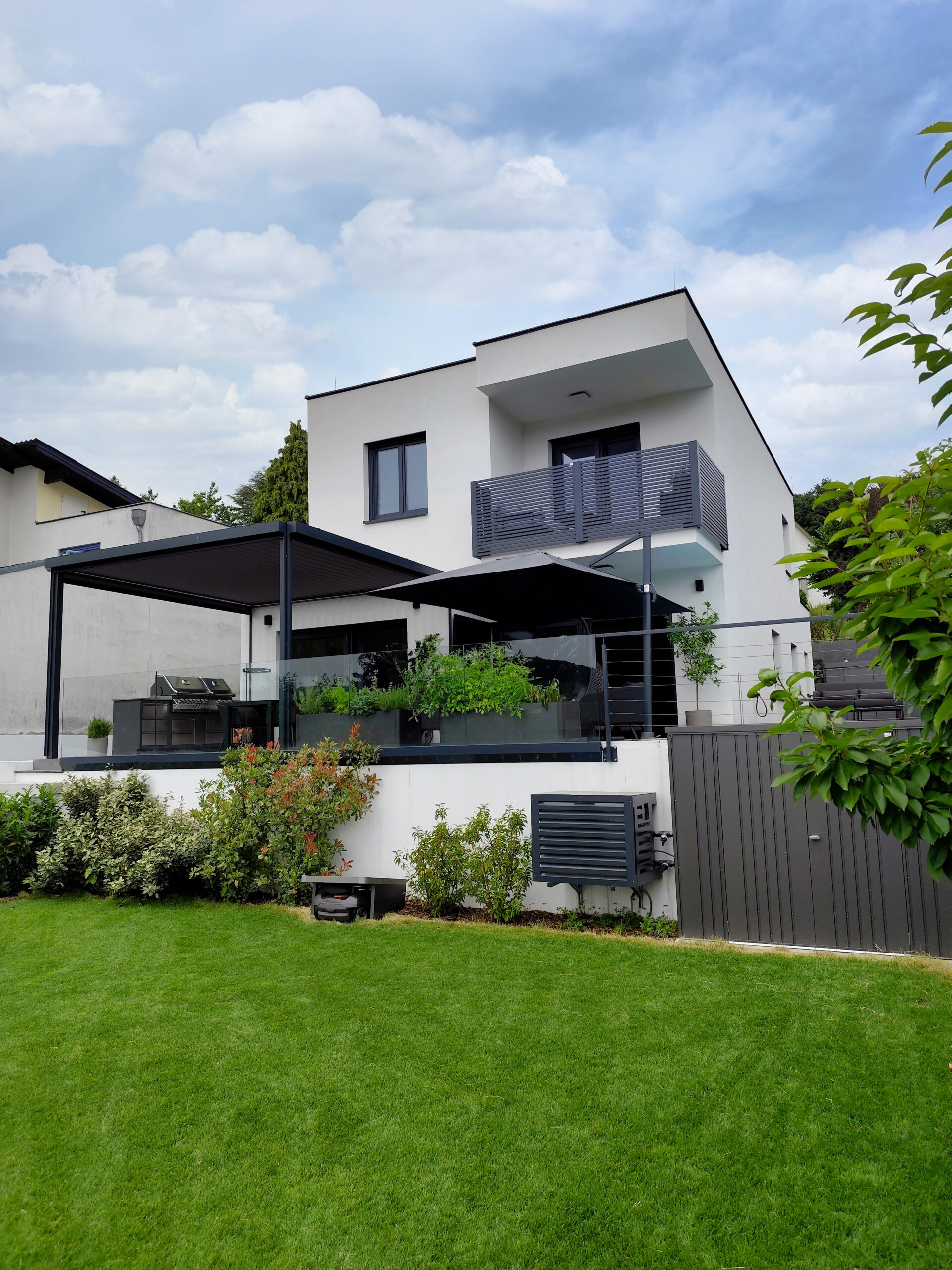 Dieses stilvolle Haus besticht durch seine klaren Linien und die elegante, moderne Fassade, die zeitlose Ästhetik mit zeitgemäßer Funktionalität vereint. Die großzügige Terrasse, ausgestattet mit einer charmanten Pergola und einem durchdachten Sonnenschutz, bietet Ihnen einen idealen Rückzugsort zum Entspannen und Genießen – perfekt für unvergessliche Momente im Freien.