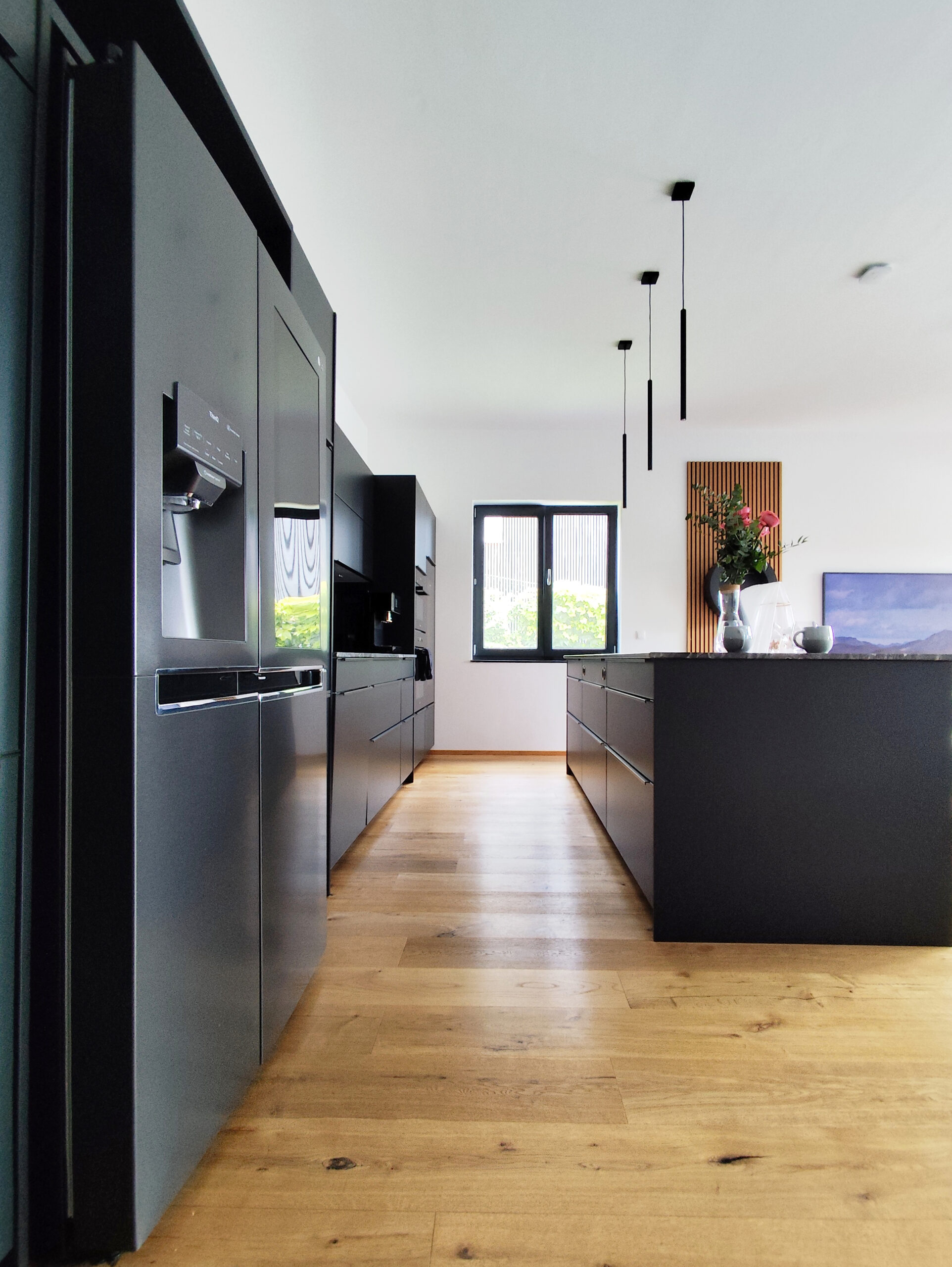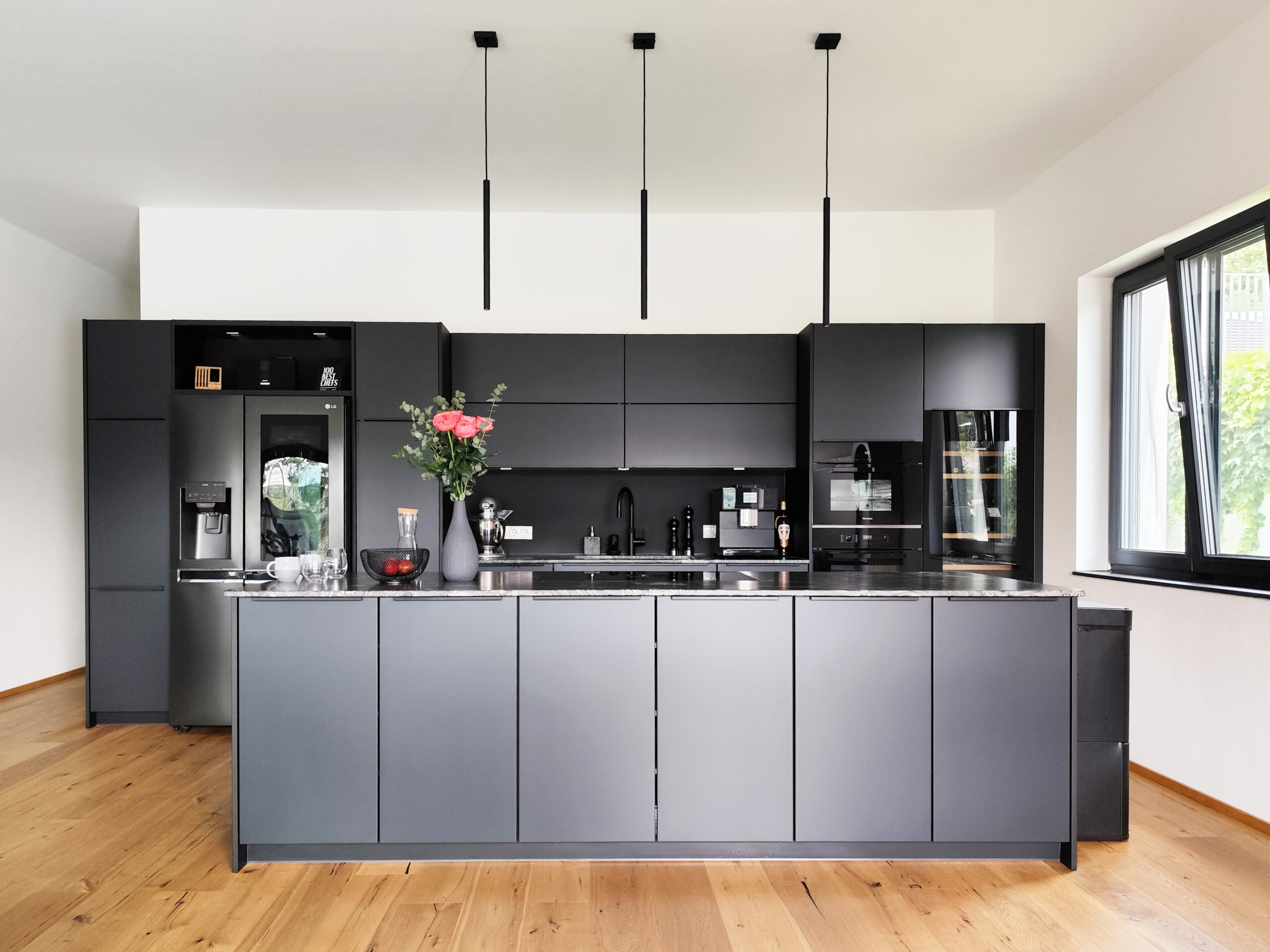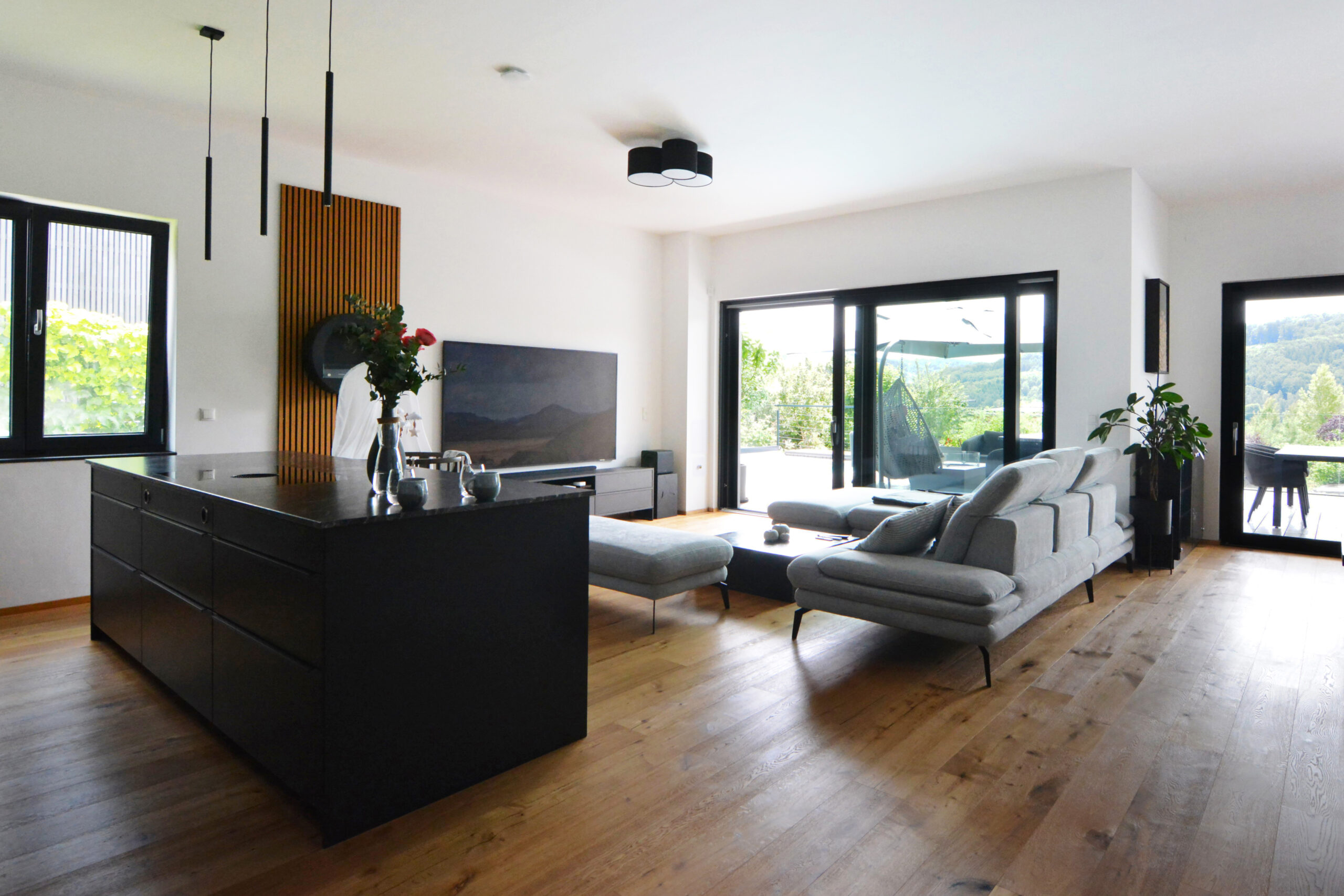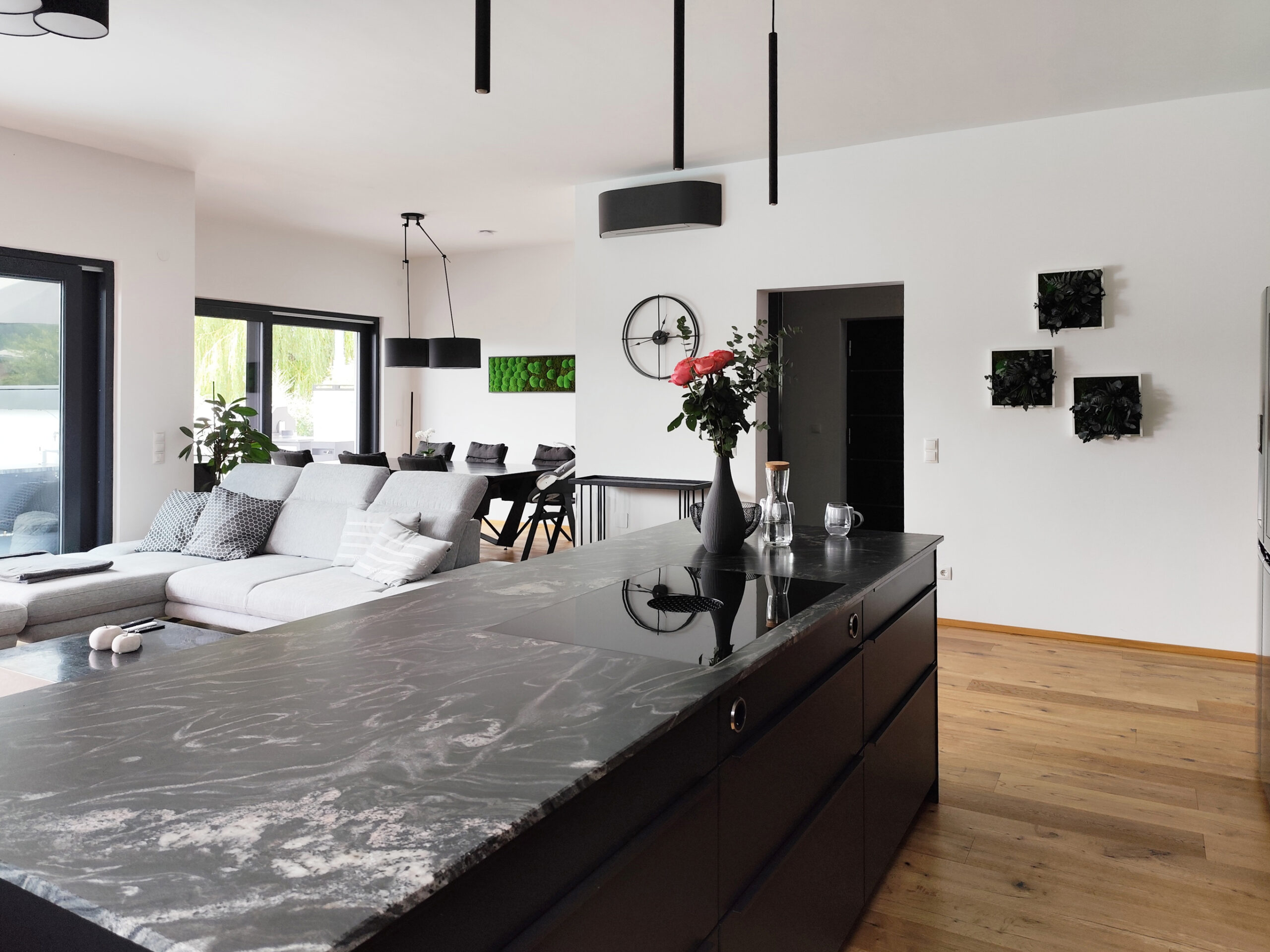 Die klaren, schlichten Linien der Möbel und Einrichtungsgegenstände spiegeln die durchdachte Funktionalität des Hauses wider. Die Kücheninsel aus schwarzem Granit beispielsweise, die als Herzstück der Küche fungiert, ist nicht nur ein stilistisches Highlight, sondern auch äußerst praktisch. Sie bietet reichlich Arbeits- und Stauraum, und das integrierte Kochfeld fügt sich nahtlos in das schlichte, aber edle Design ein.
