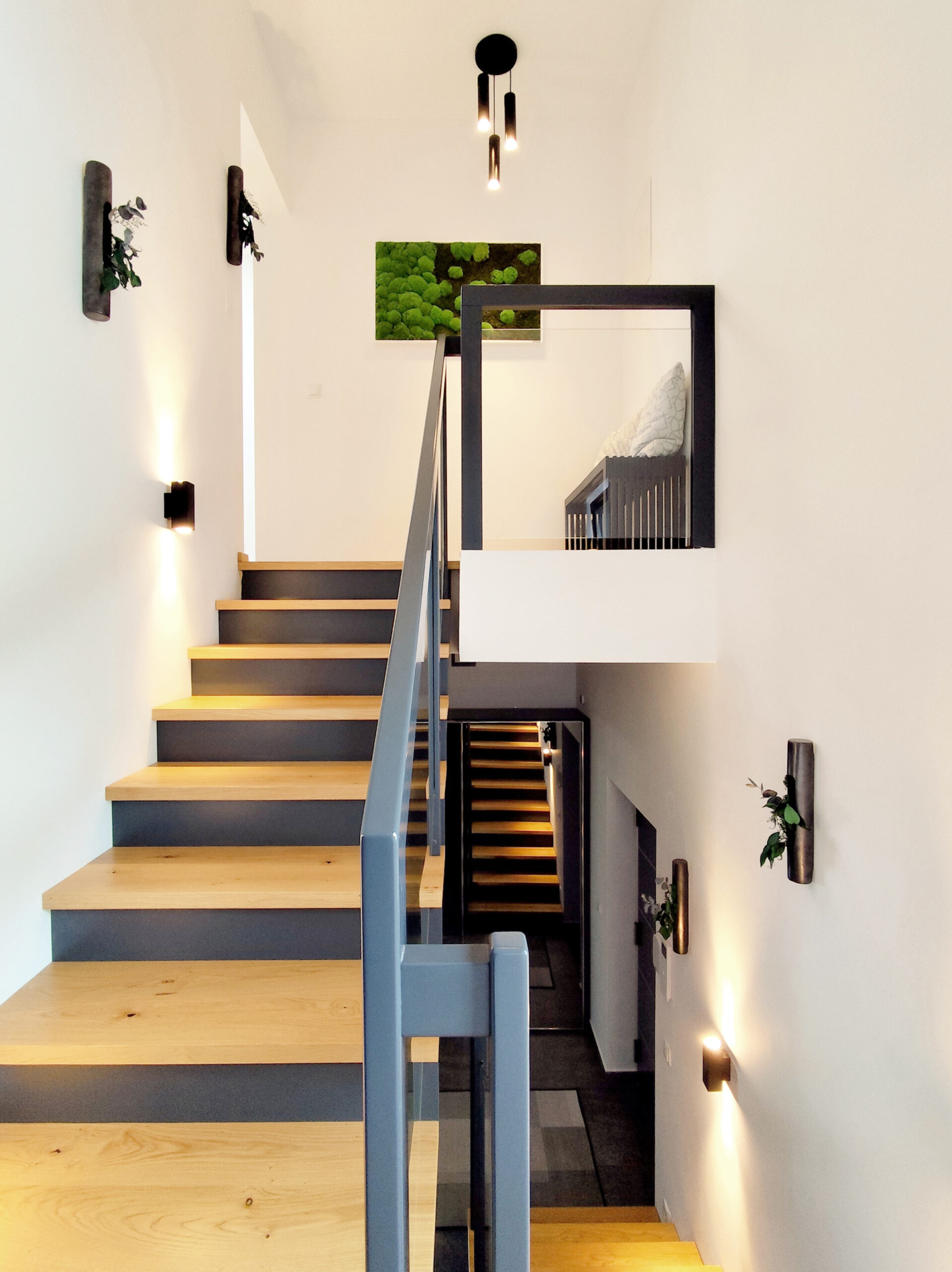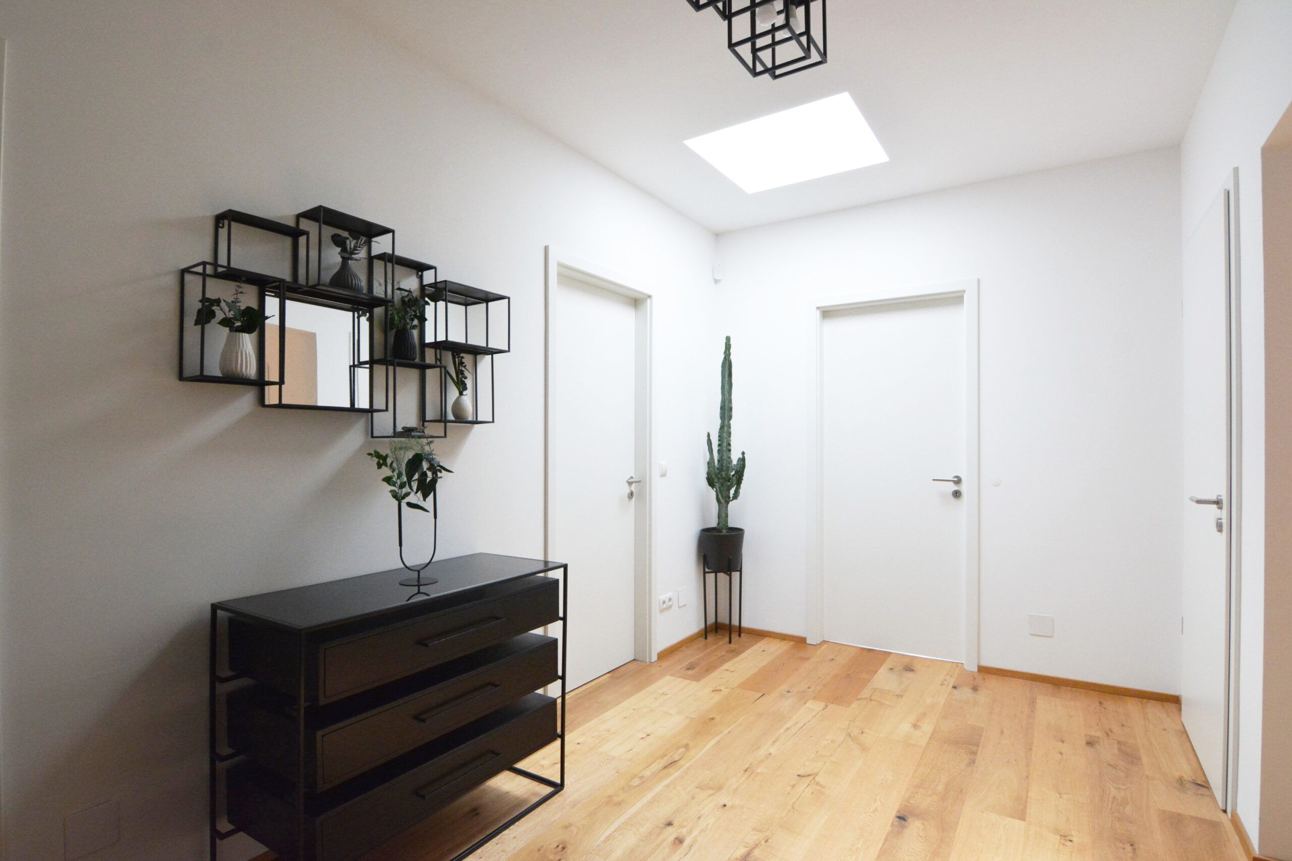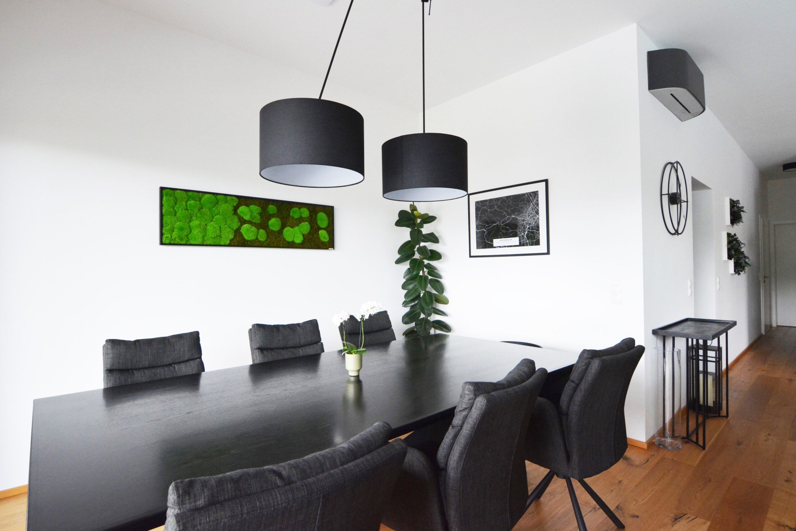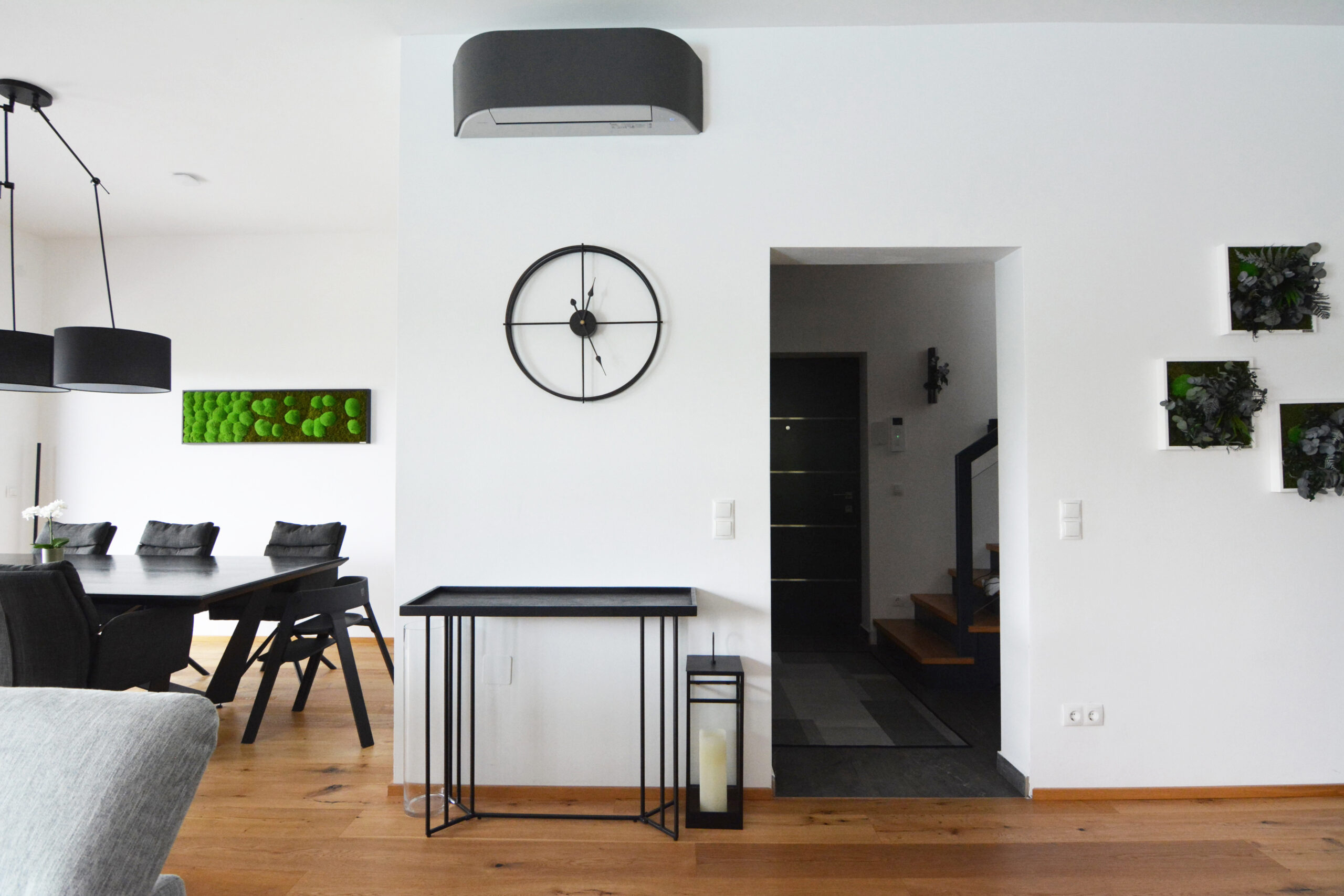 Die Verwendung natürlicher Materialien wie hellem Holz, das den gesamten Bodenbereich des Hauses bedeckt, spielt eine zentrale Rolle in der Atmosphäre des Hauses. Das Holz verleiht dem Raum eine warme und einladende Ausstrahlung, die den minimalistischen Stil perfekt ergänzt und gleichzeitig ein Gefühl von Naturverbundenheit schafft. Diese Natürlichkeit wird durch dezente Dekorelemente wie Zimmerpflanzen und Wandbilder mit grünen Motiven noch weiter verstärkt, die Frische und Lebendigkeit in den Raum bringen.