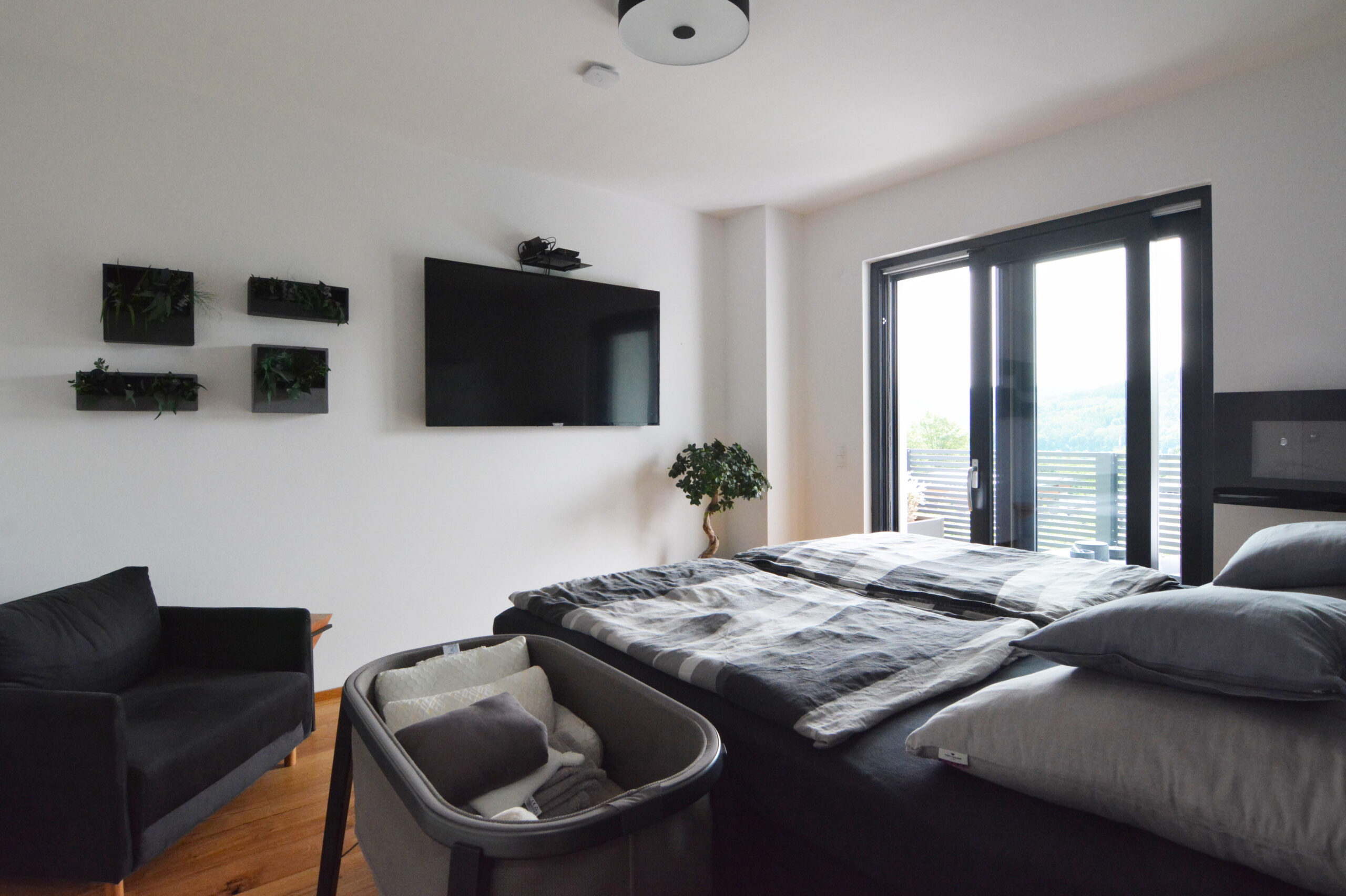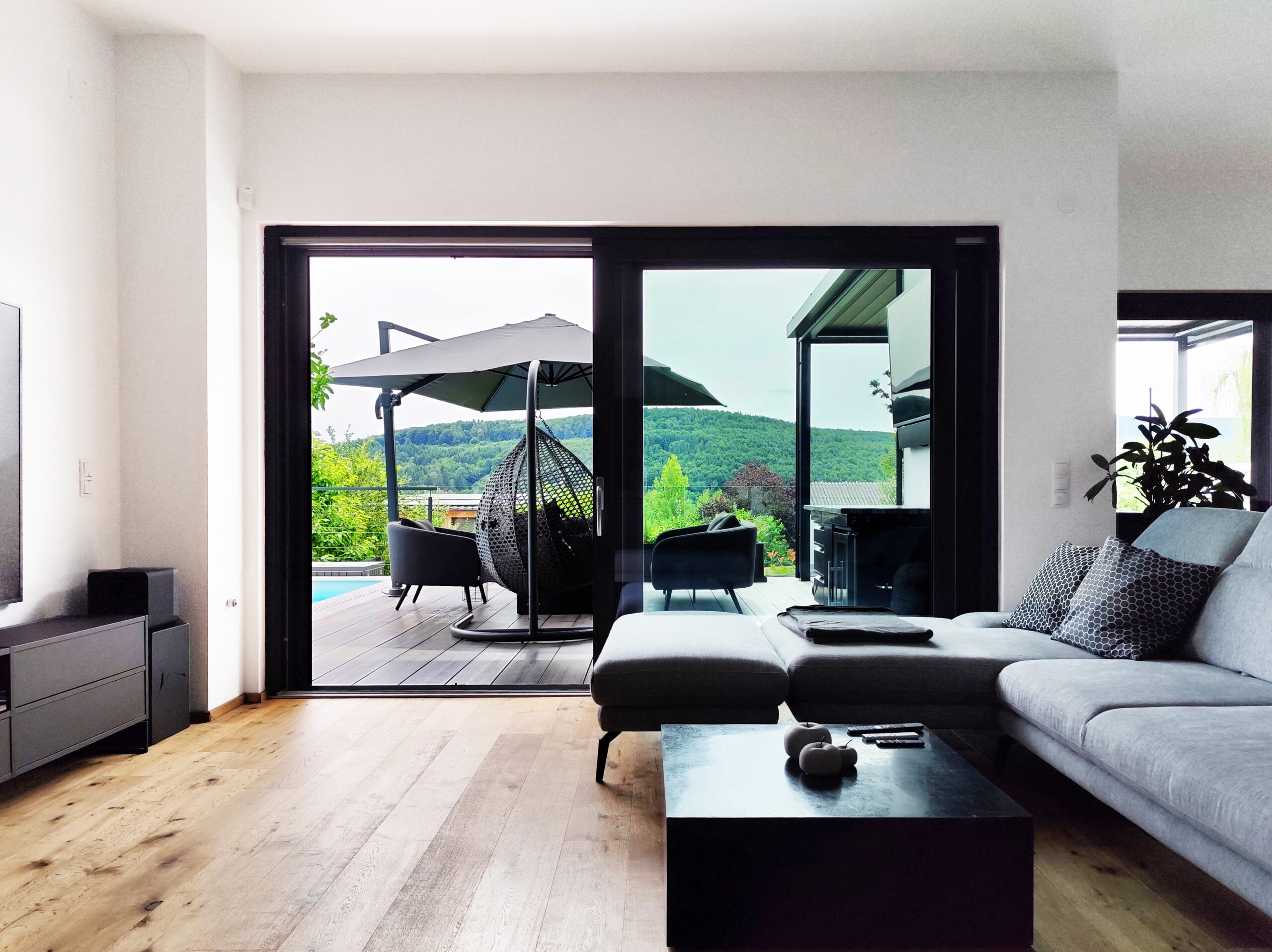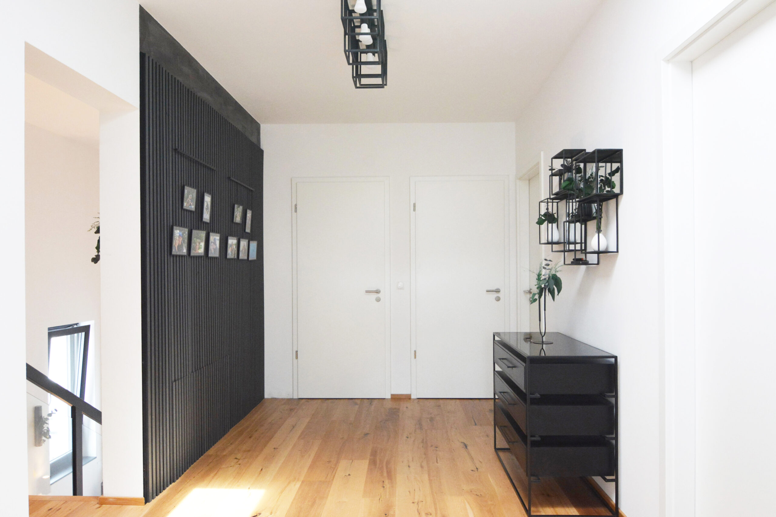 Die Verwendung natürlicher Materialien wie hellem Holz, das den gesamten Bodenbereich des Hauses bedeckt, spielt eine zentrale Rolle in der Atmosphäre des Hauses. Das Holz verleiht dem Raum eine warme und einladende Ausstrahlung, die den minimalistischen Stil perfekt ergänzt und gleichzeitig ein Gefühl von Naturverbundenheit schafft. Diese Natürlichkeit wird durch dezente Dekorelemente wie Zimmerpflanzen und Wandbilder mit grünen Motiven noch weiter verstärkt, die Frische und Lebendigkeit in den Raum bringen.