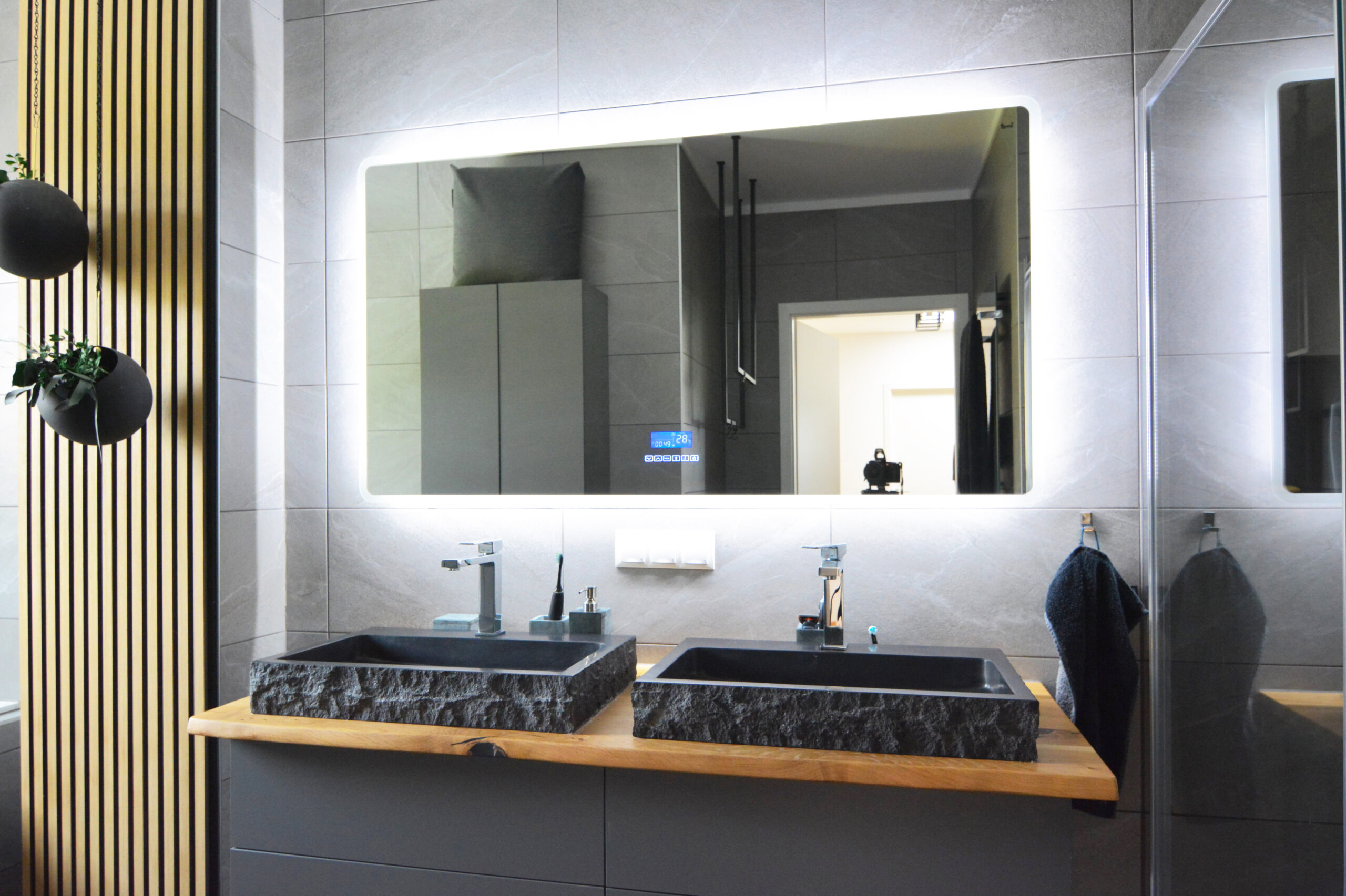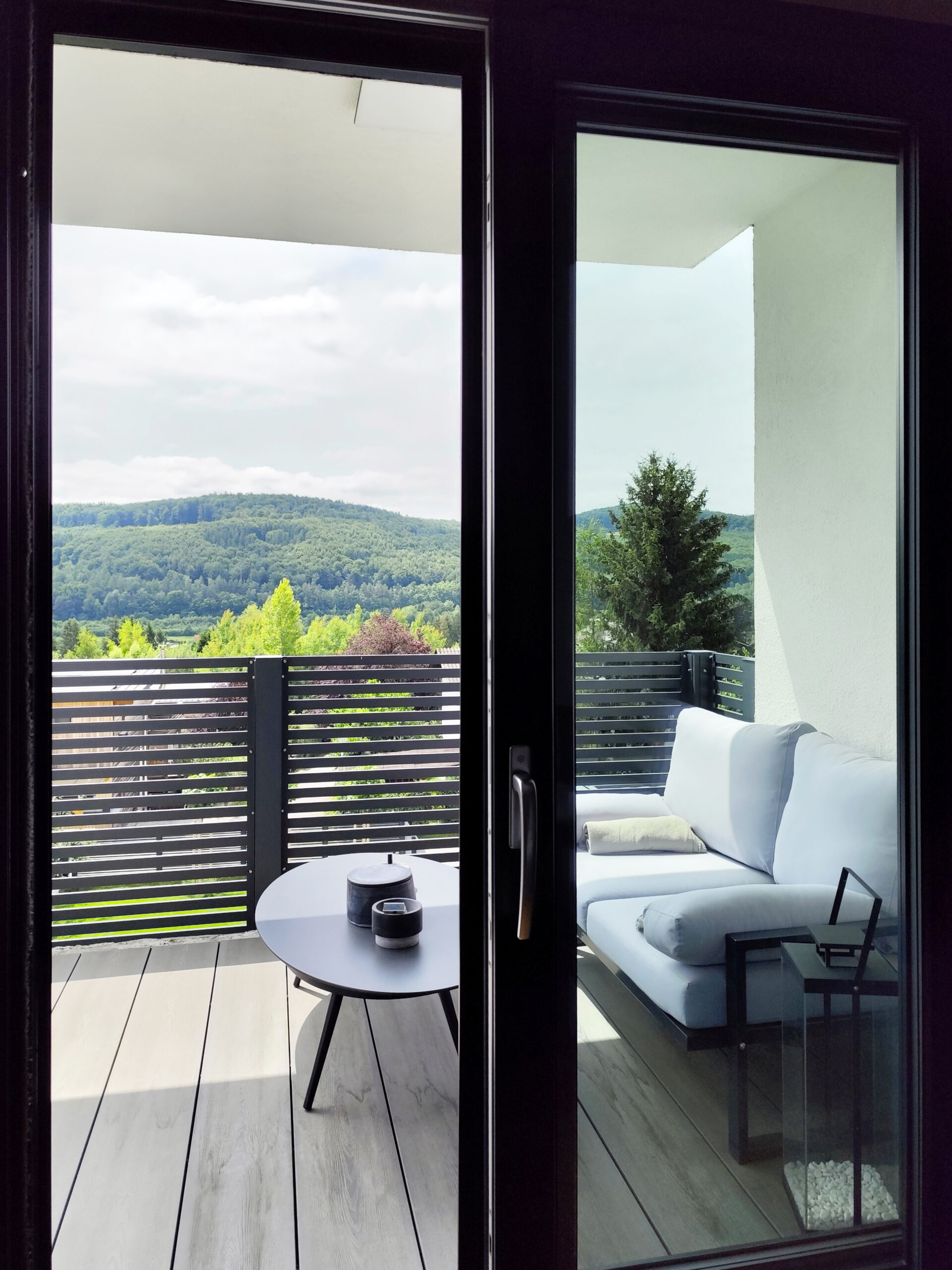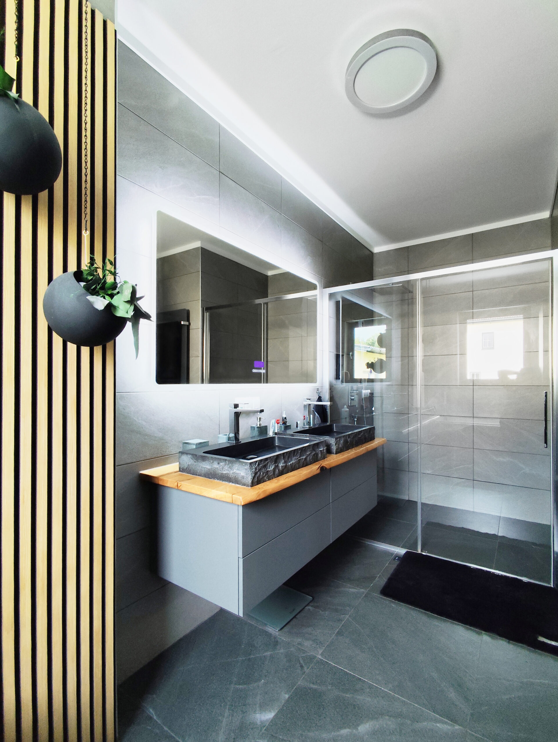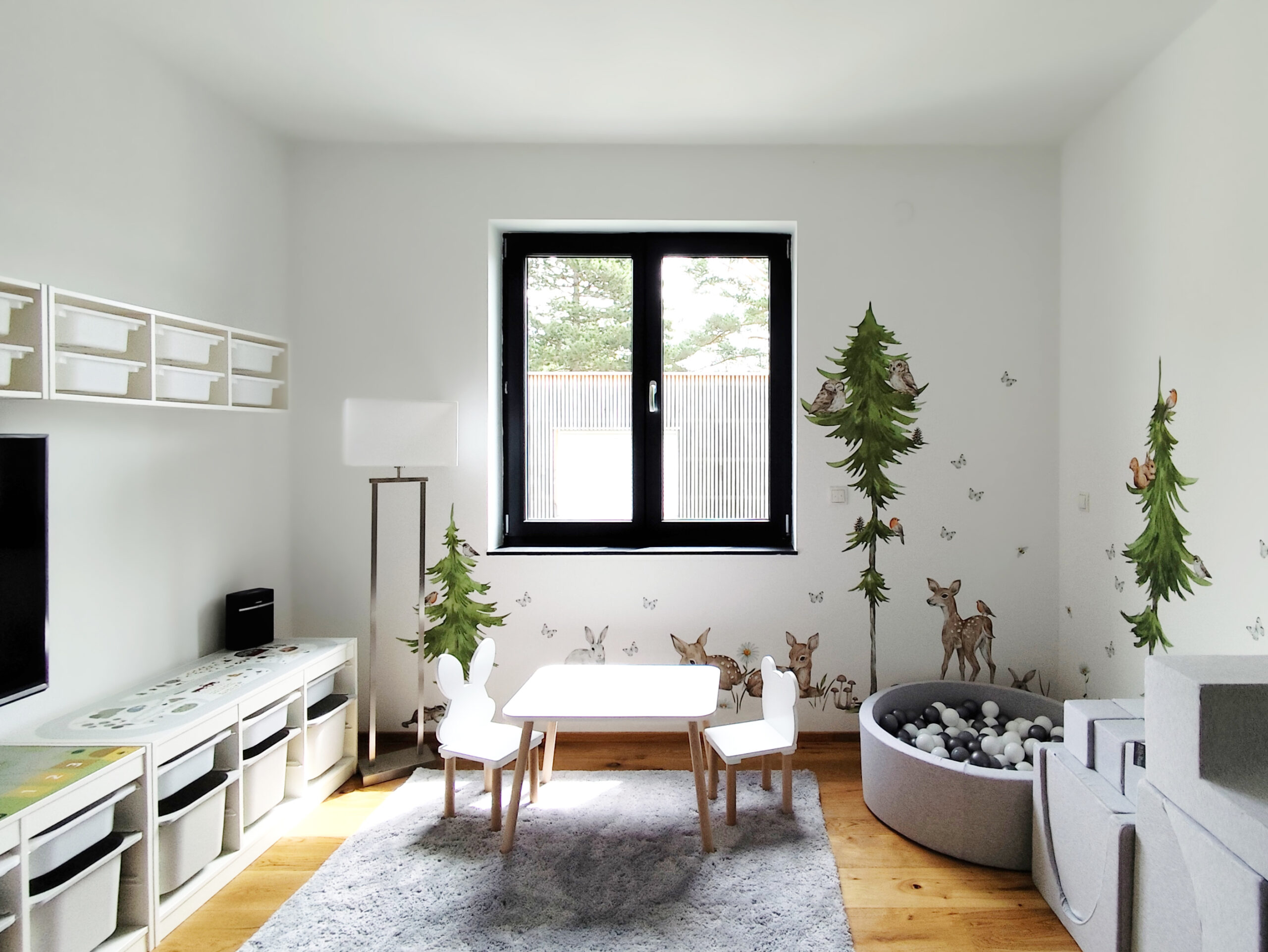 Die Verwendung natürlicher Materialien wie hellem Holz, das den gesamten Bodenbereich des Hauses bedeckt, spielt eine zentrale Rolle in der Atmosphäre des Hauses. Das Holz verleiht dem Raum eine warme und einladende Ausstrahlung, die den minimalistischen Stil perfekt ergänzt und gleichzeitig ein Gefühl von Naturverbundenheit schafft. Diese Natürlichkeit wird durch dezente Dekorelemente wie Zimmerpflanzen und Wandbilder mit grünen Motiven noch weiter verstärkt, die Frische und Lebendigkeit in den Raum bringen.